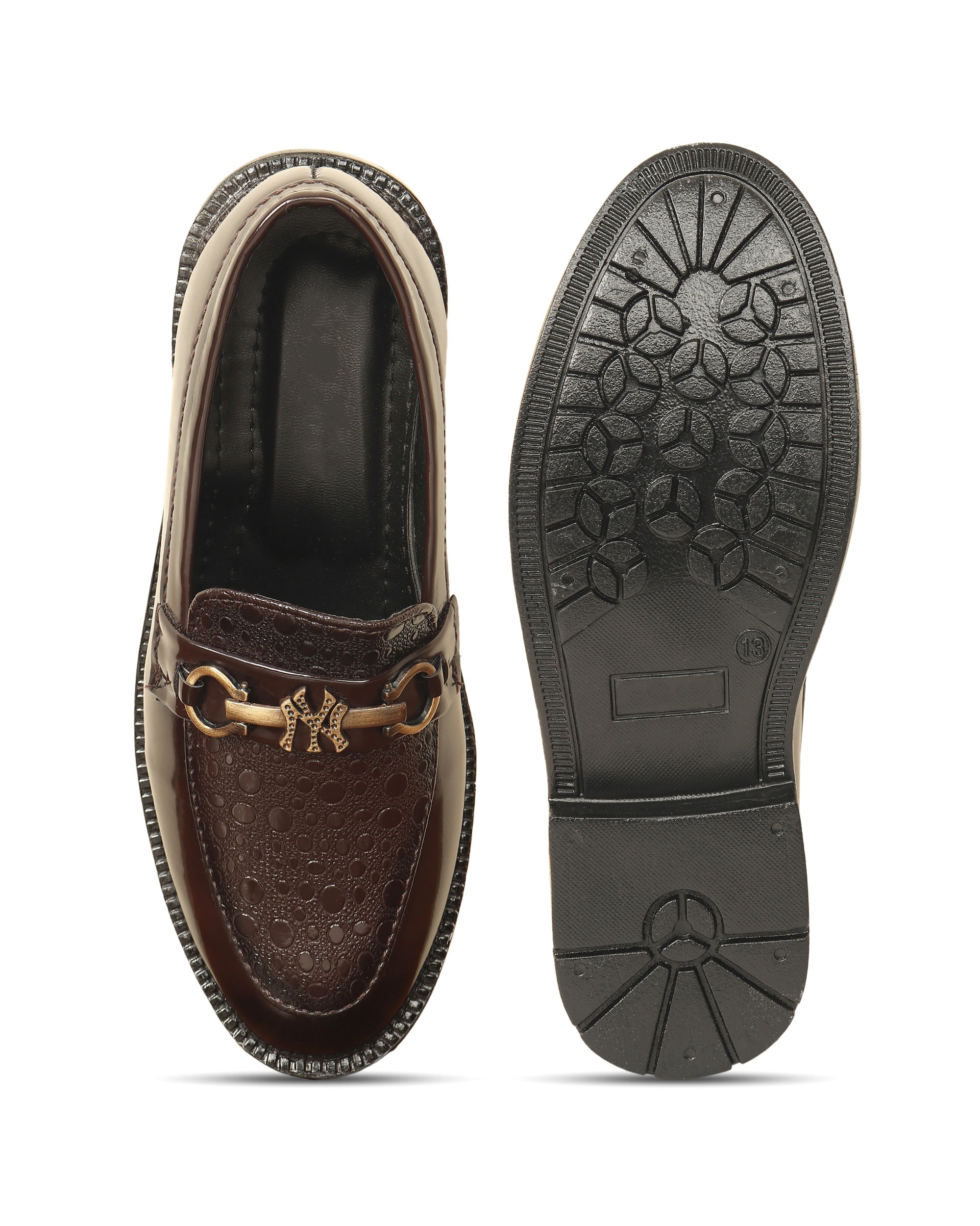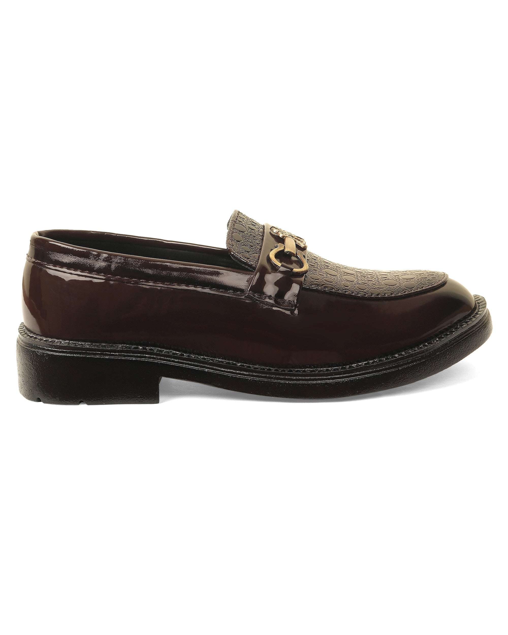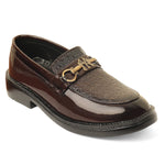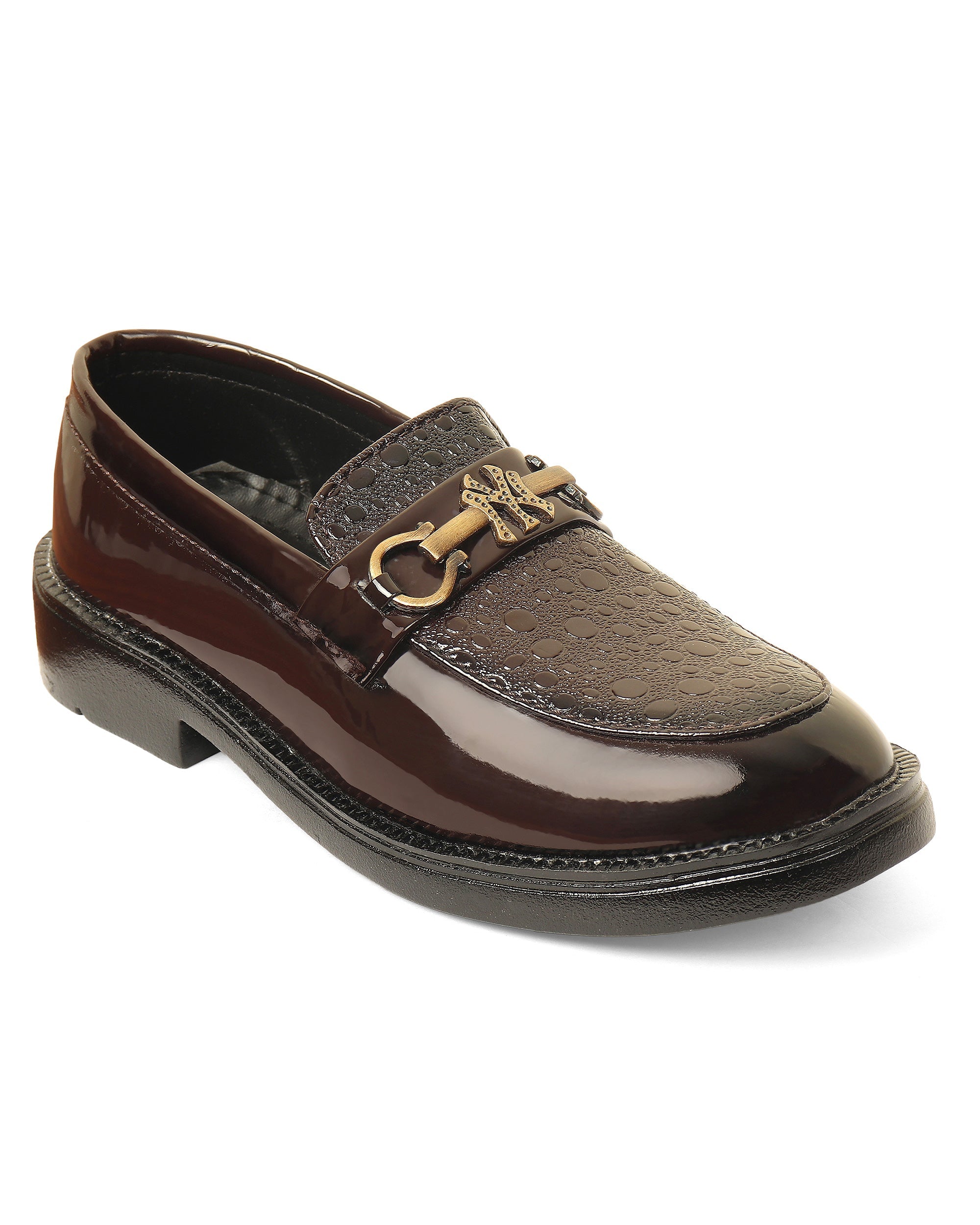 Freeplay boys’ fashion loafers in glossy black, brown, and tan with gold buckle and textured detail. Perfect for weddings, parties, and stylish festive dressing.