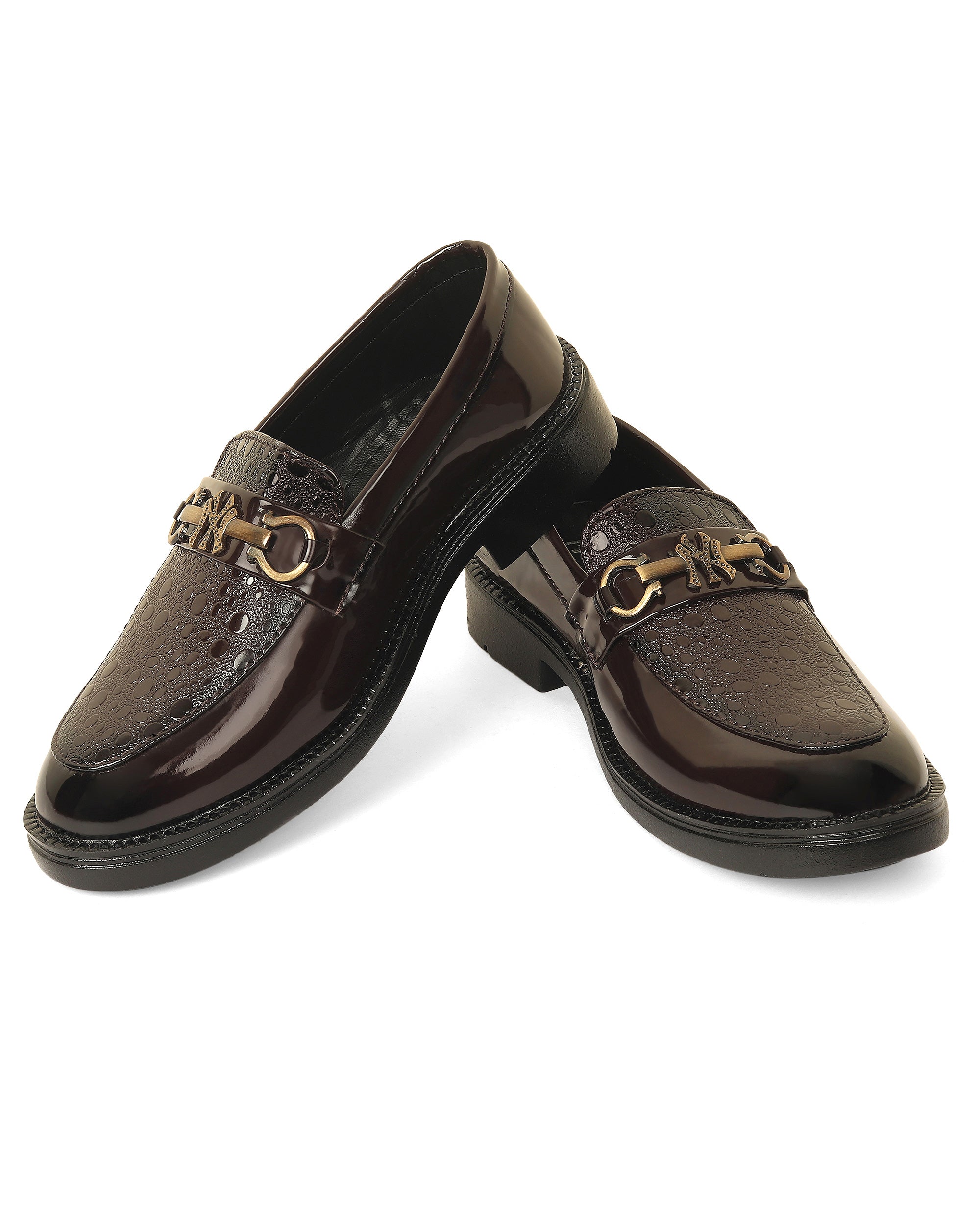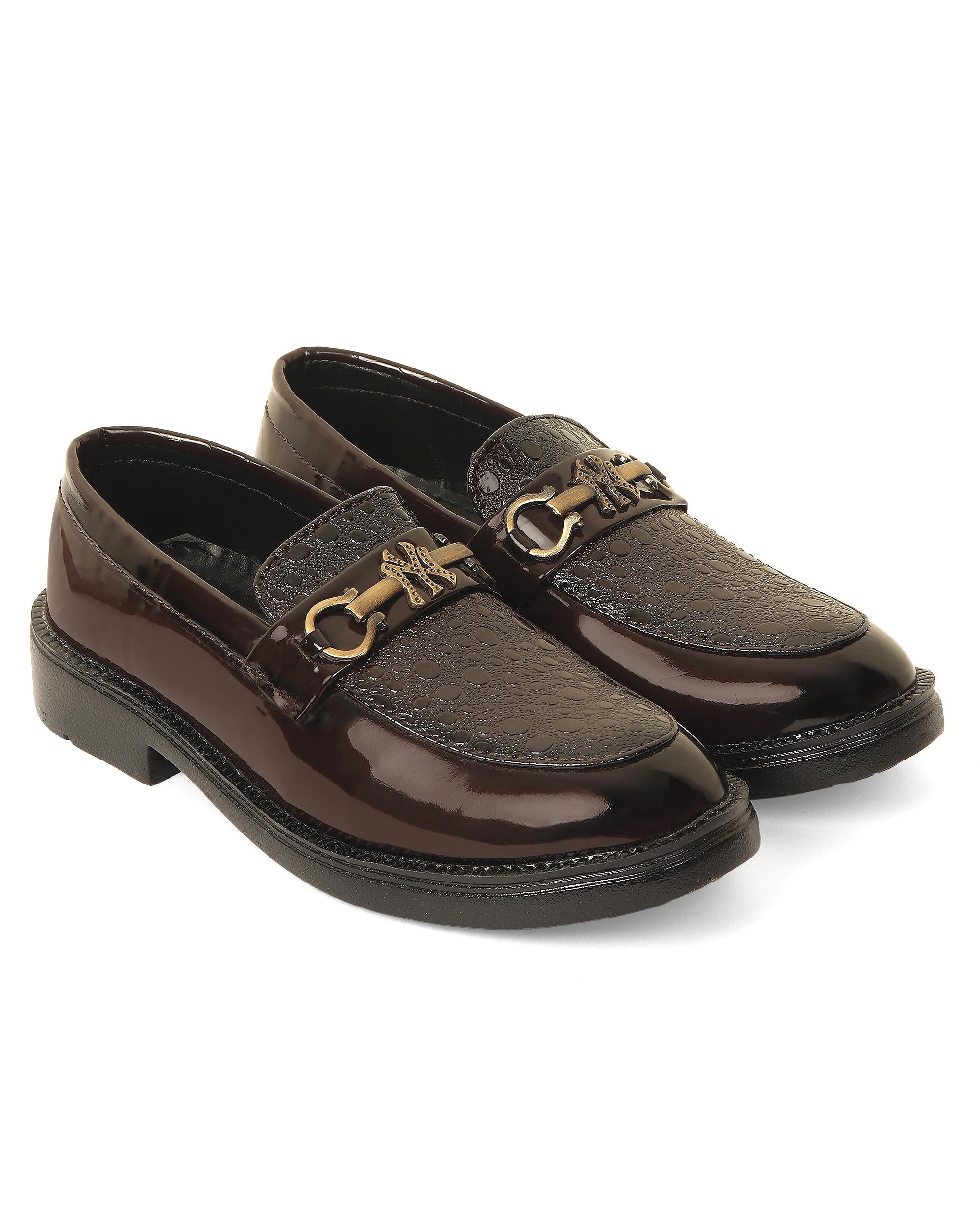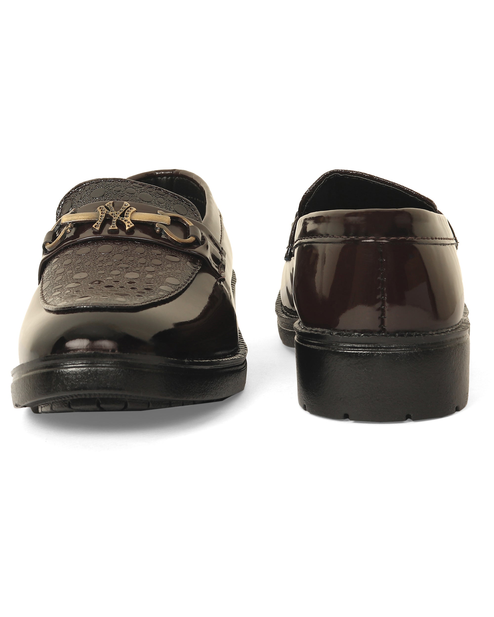Freeplay boys’ fashion loafers in glossy black, brown, and tan with gold buckle and textured detail. Perfect for weddings, parties, and stylish festive dressing.