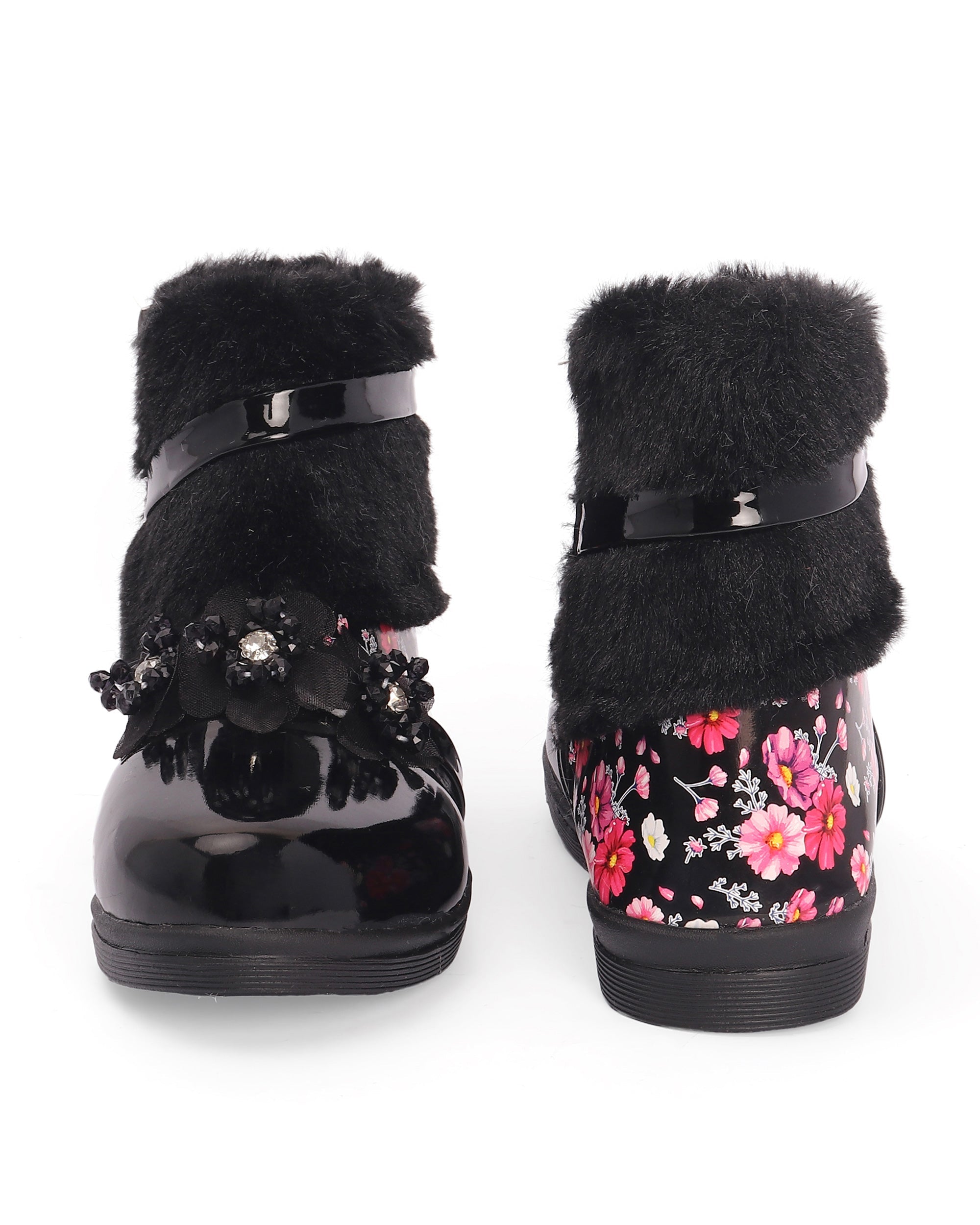 Add a pop of style to her step! These trendy boots feature floral sparkle, fluffy cuffs, and an easy zip closure for quick wear. Perfect for playdates, outings, or dressing up. Available in 5 fashionable colors every little trendsetter will love!