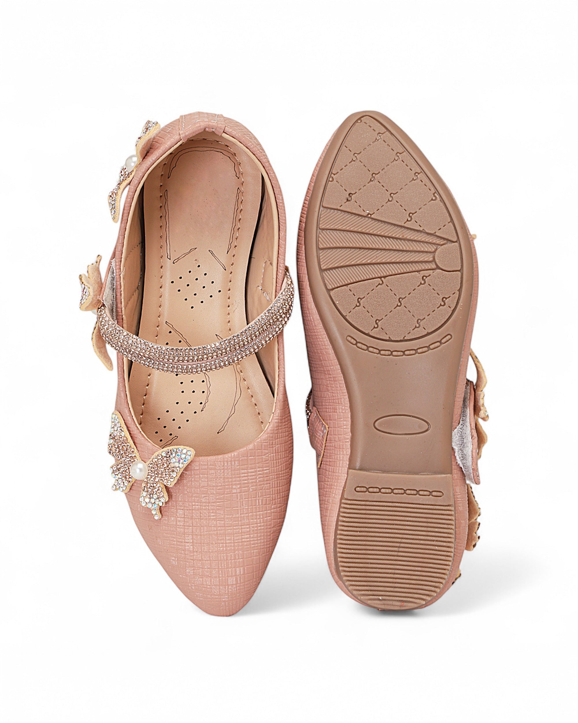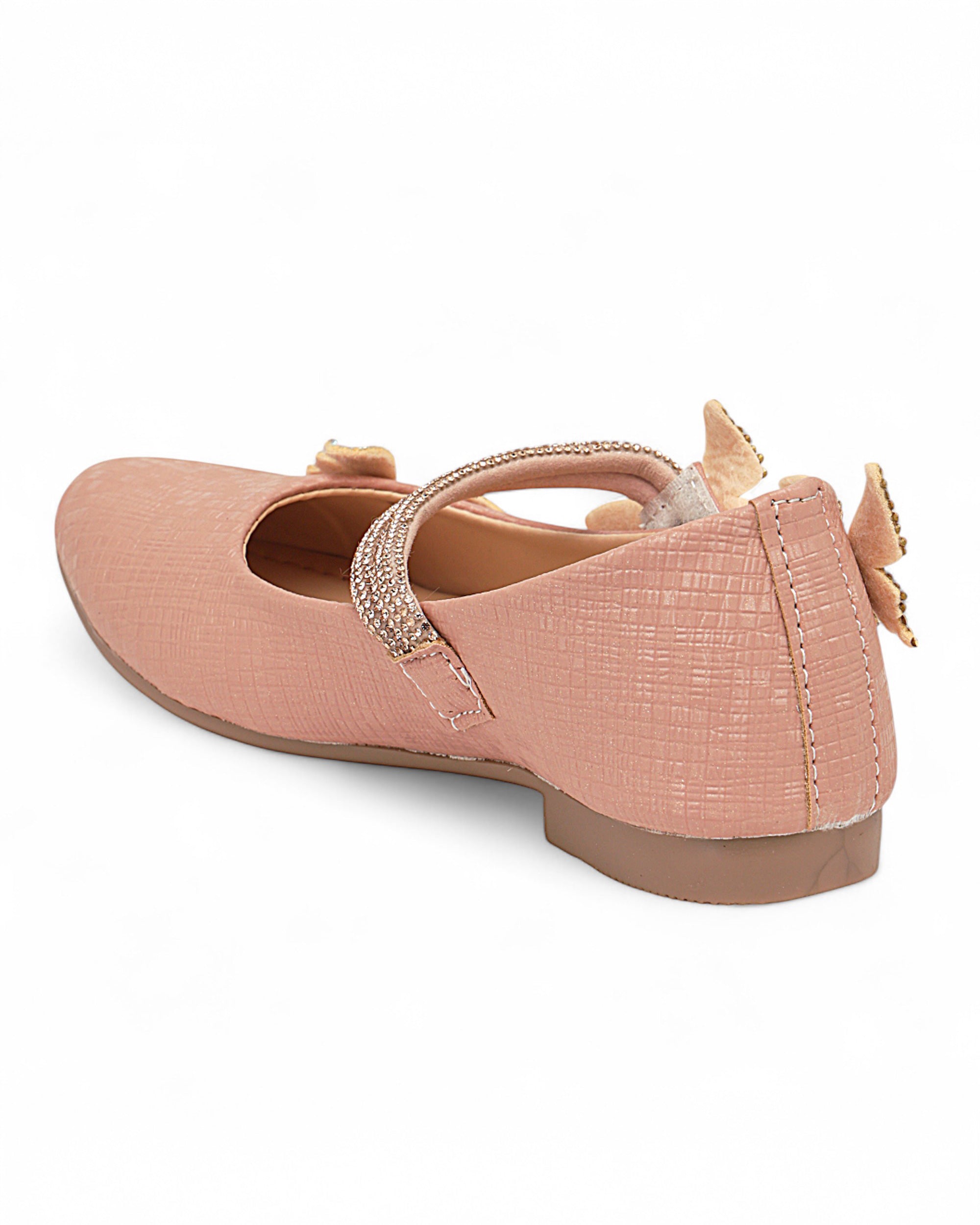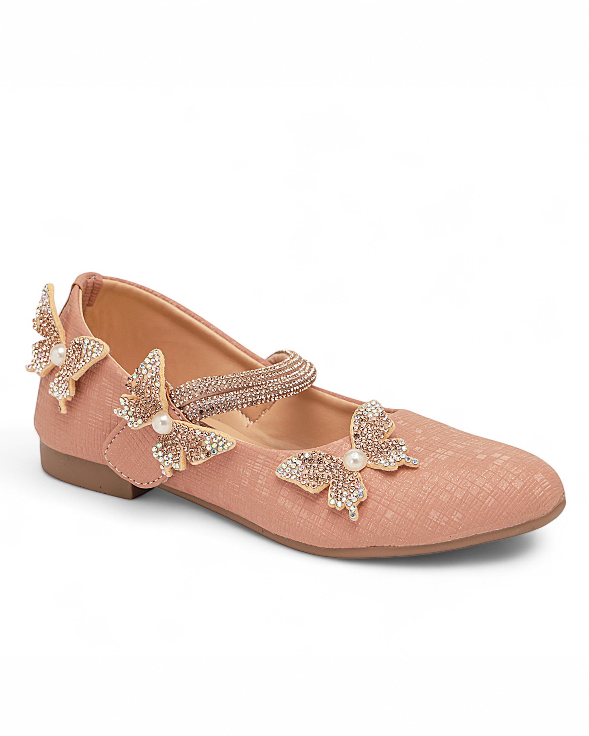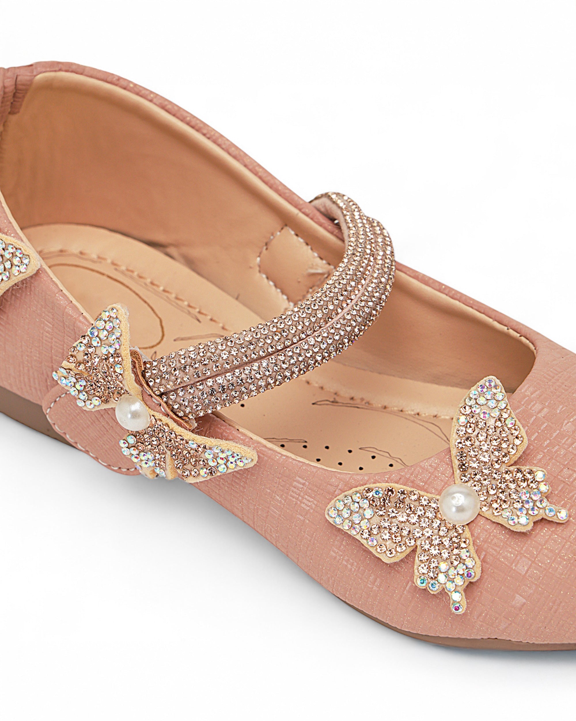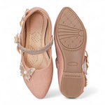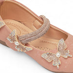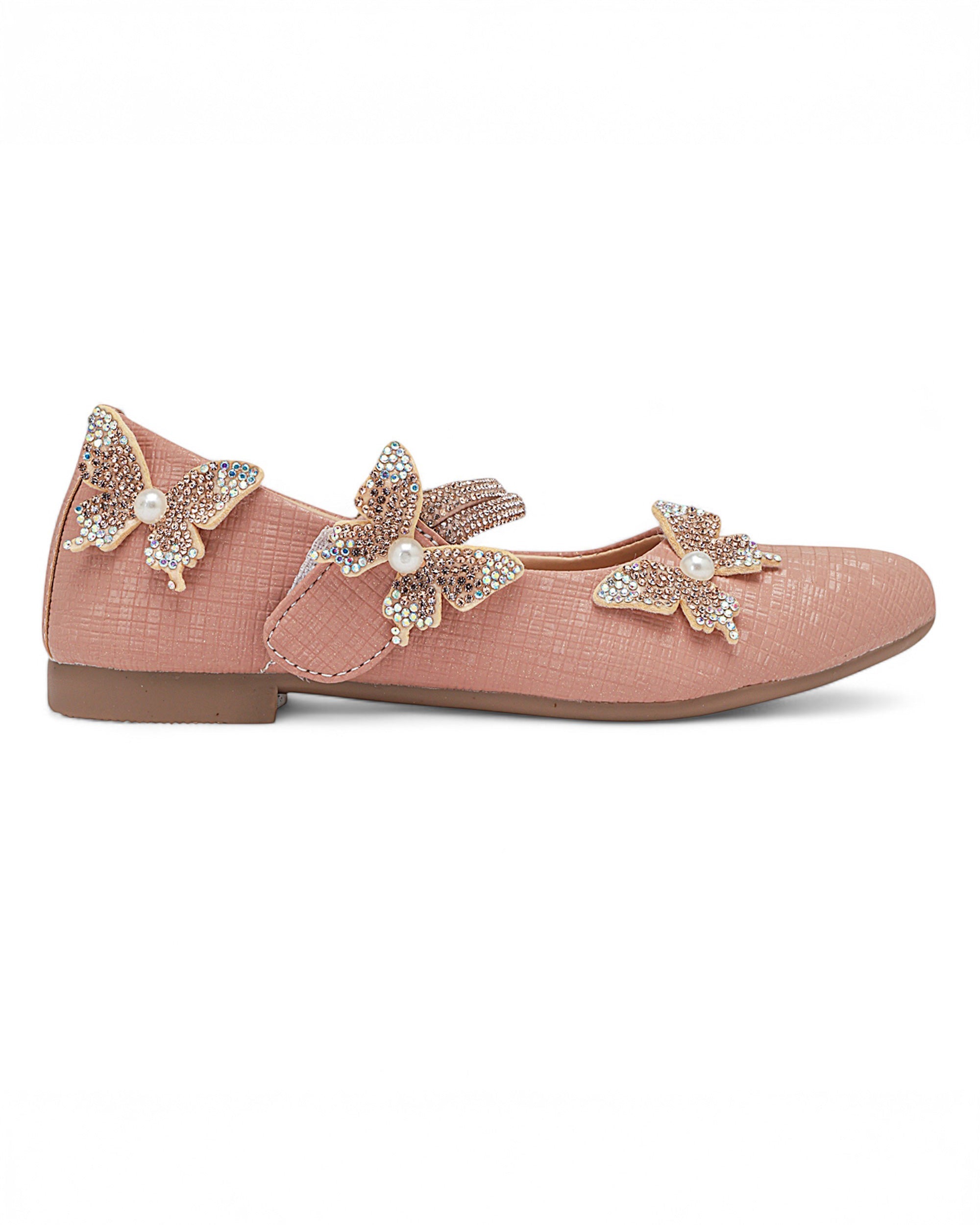 Delicate and dazzling, Freeplay Girls Butterfly Bellies bring a magical touch to every festive outfit. Featuring pearl-studded butterfly embellishments, a shimmery ankle strap, and soft faux leather comfort, these party-perfect flats ensure both charm and ease. Ideal for weddings, birthdays, or festive celebrations. Available in black, beige, and pink. Fits girls aged 2.5–9 years.