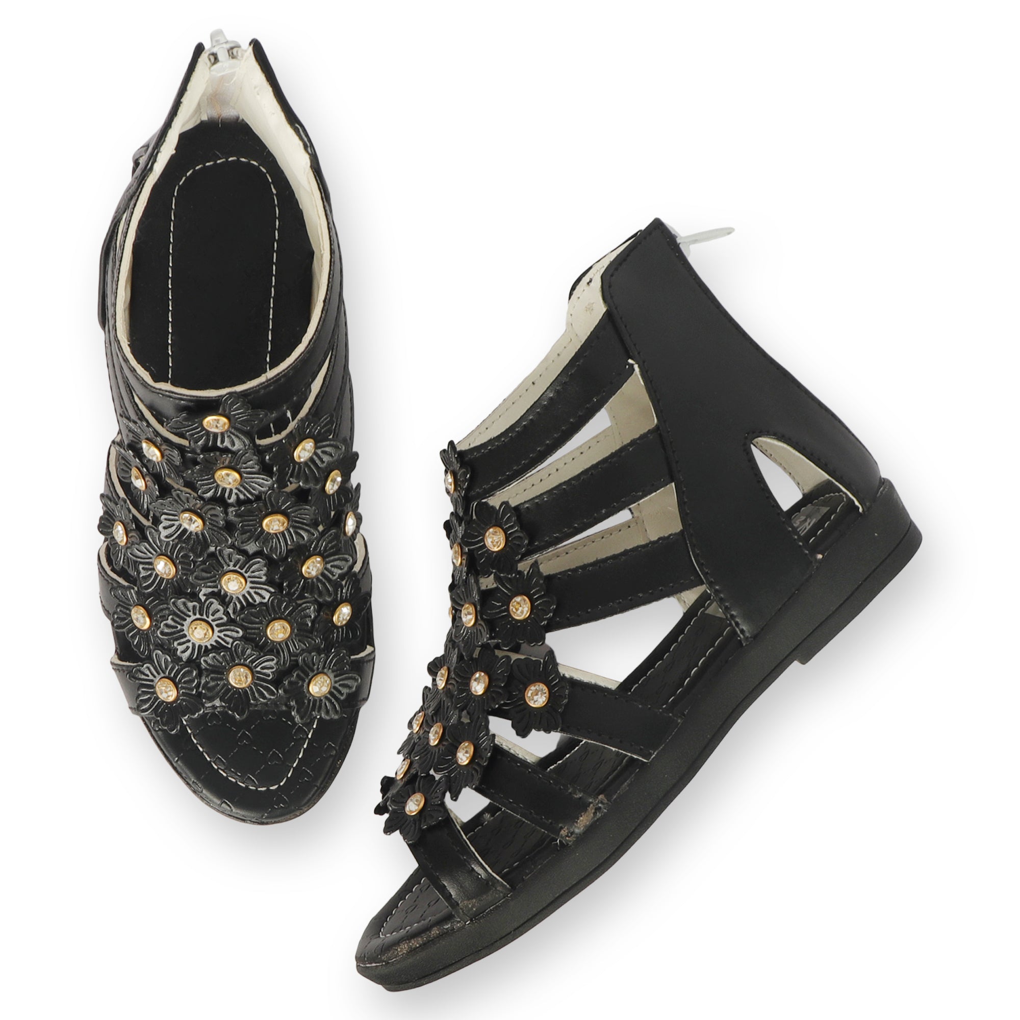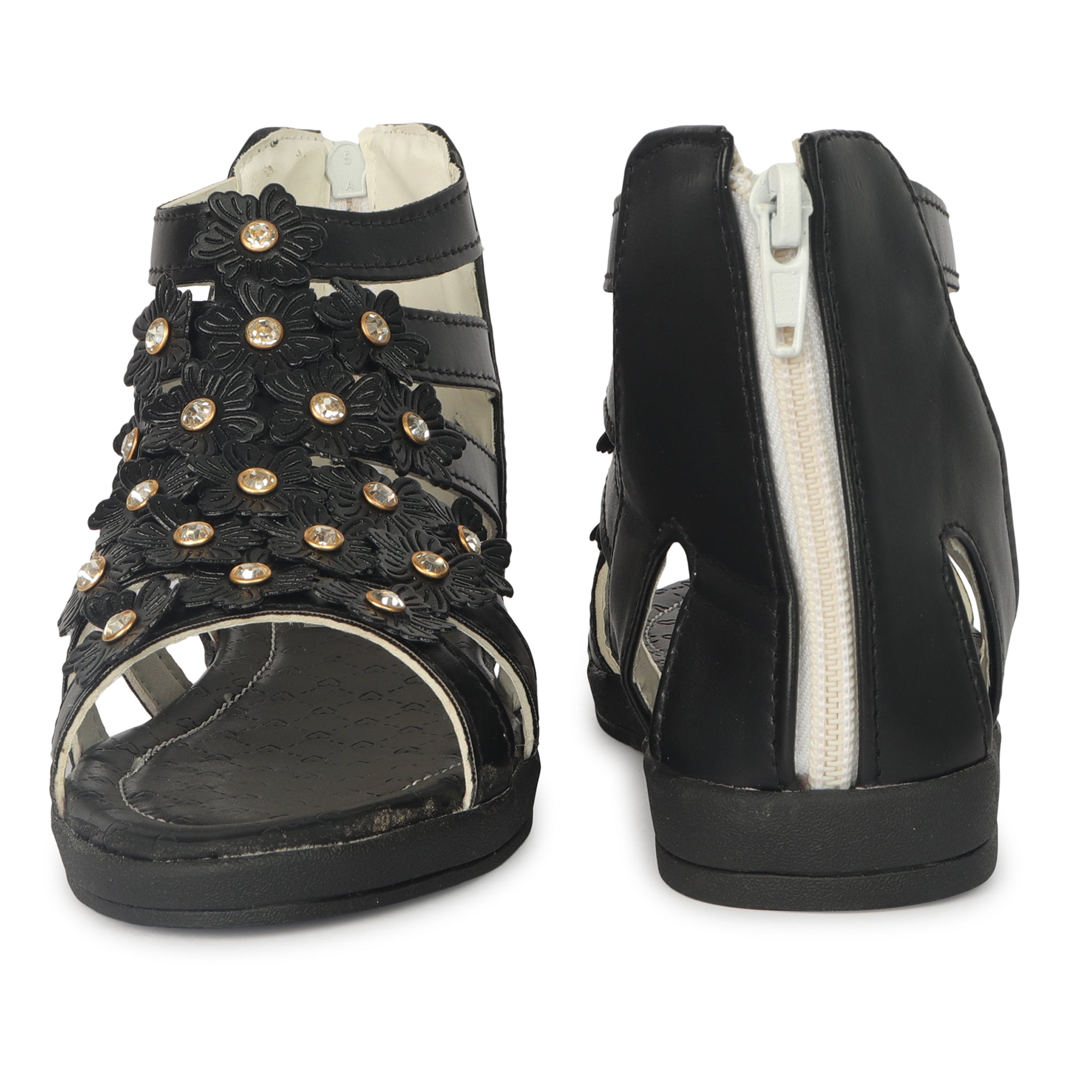 Let her shine in every step with Freeplay Gladiator Sandals for girls. Crafted in soft faux leather with delicate floral embellishments and a comfortable flat sole, these sandals feature a secure zip closure for easy wear. Ideal for party and smart casual looks. Available in pink, black, white, and beige for girls aged 4–9 years.