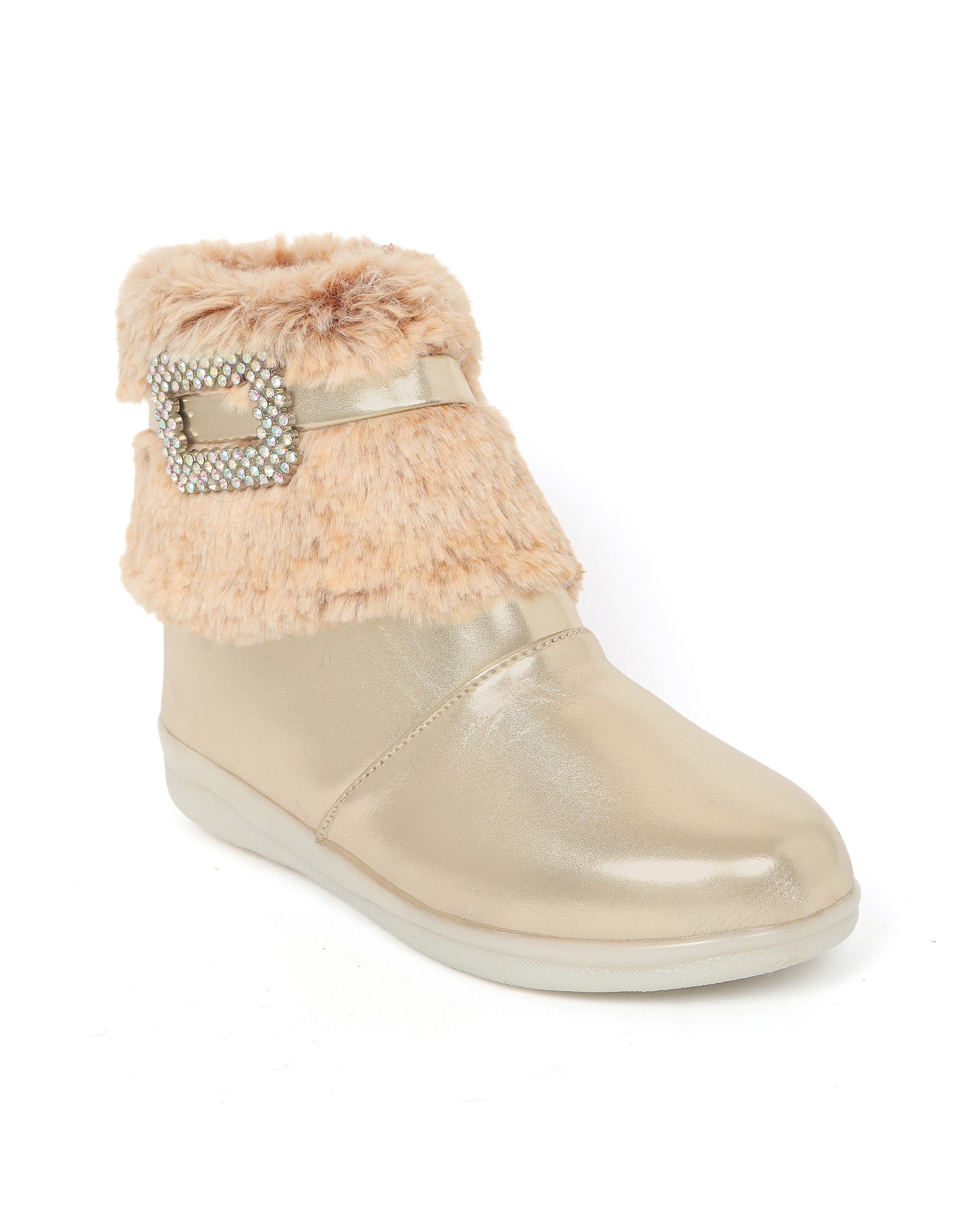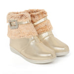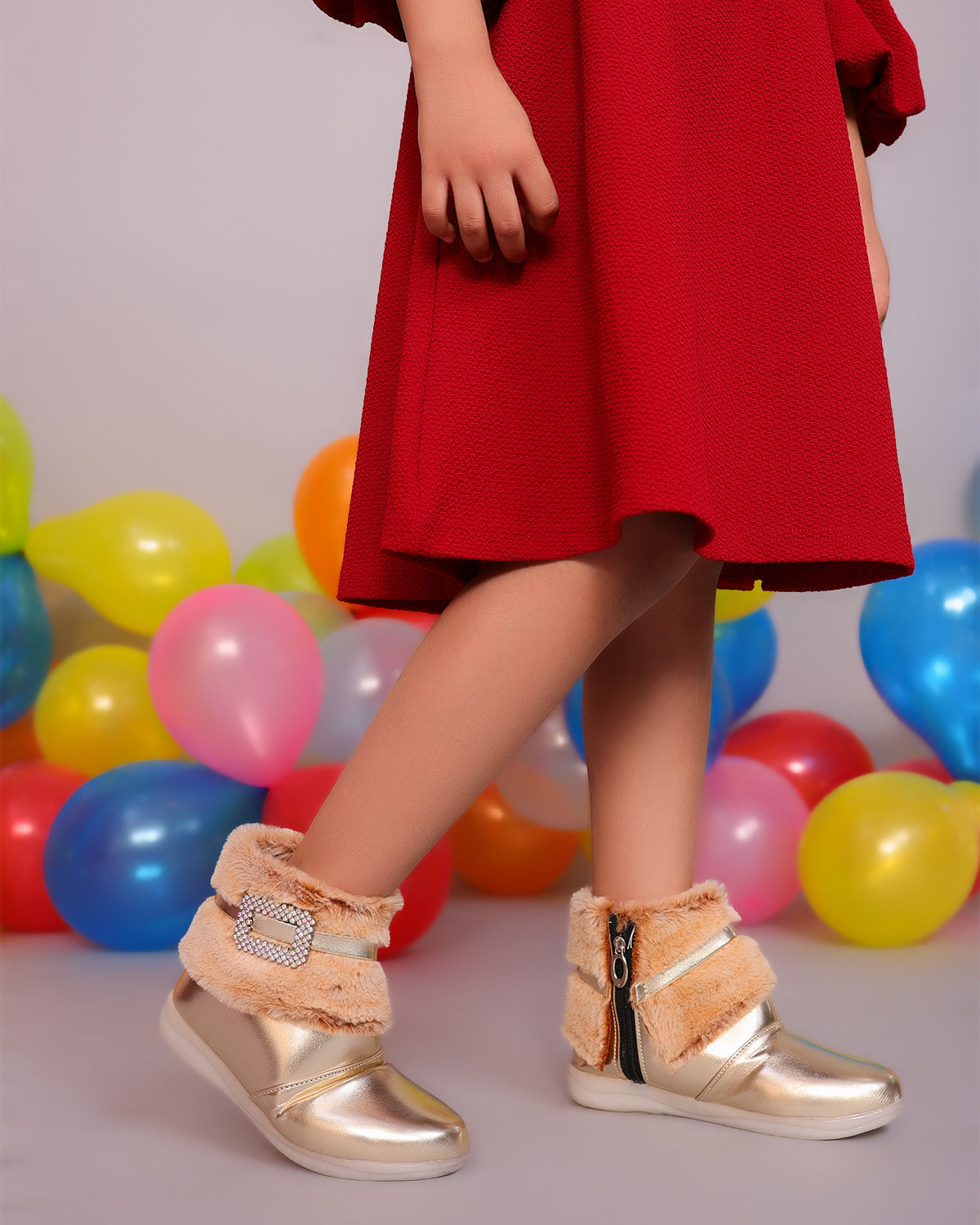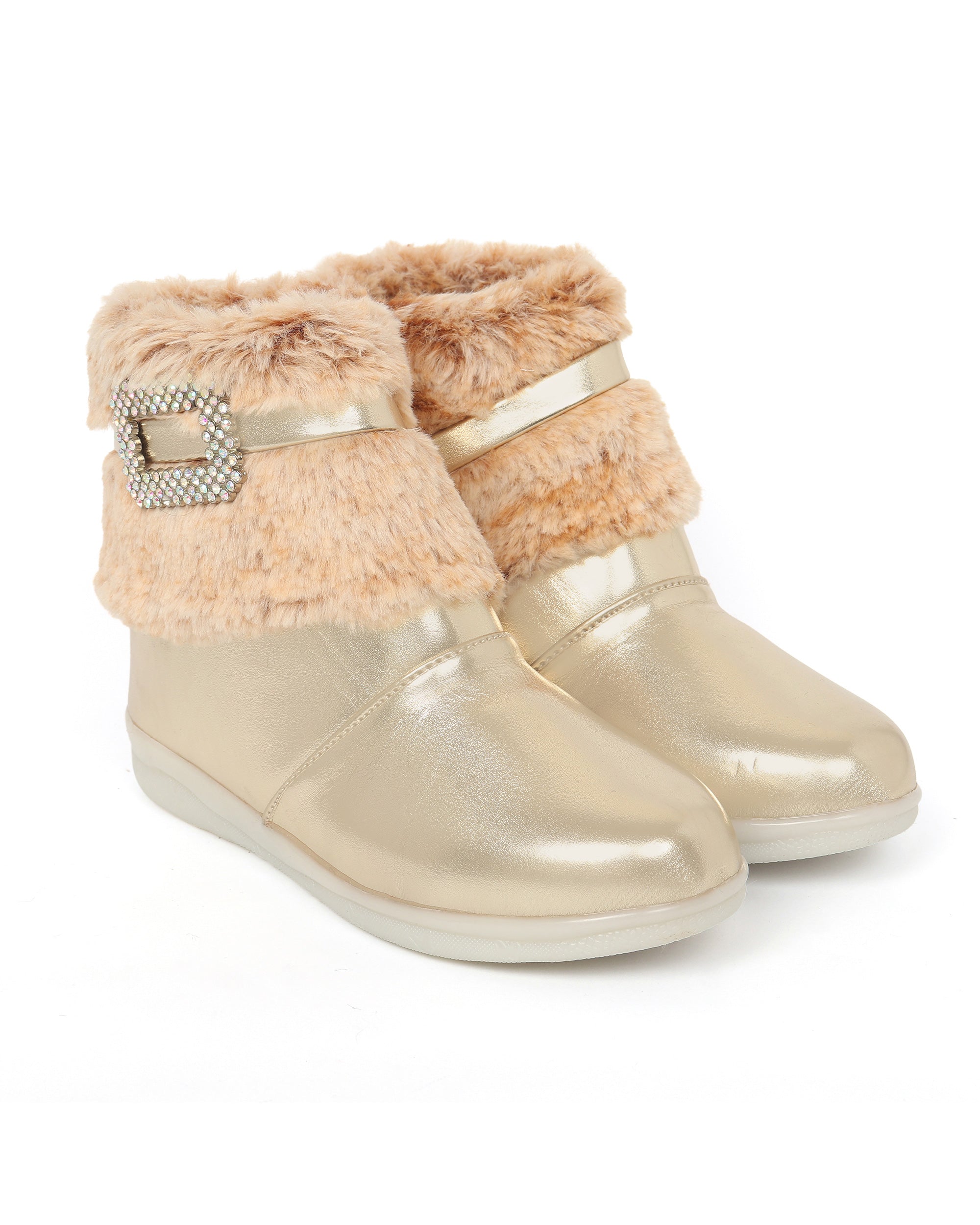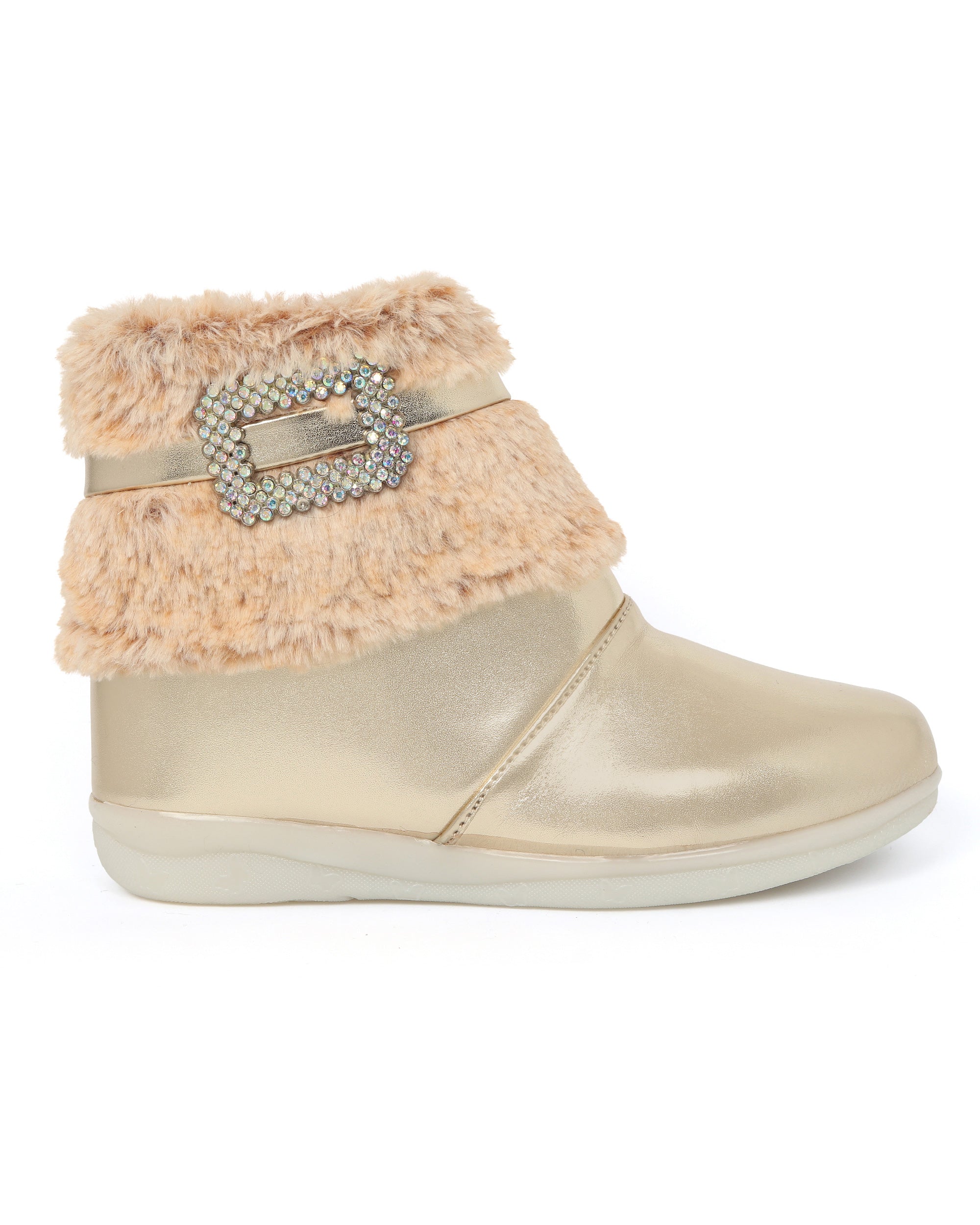 Shiney party boots for girls with faux fur cuff, sparkling crystal buckle, and side zip closure. Comfy and chic—perfect for birthdays, outings, and festive fun. Available in Golden, Silver, Red, White, and Black.