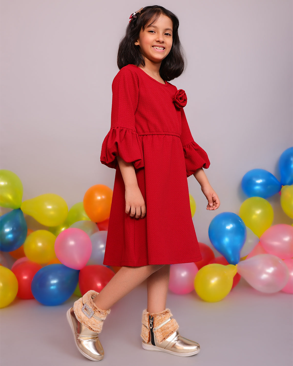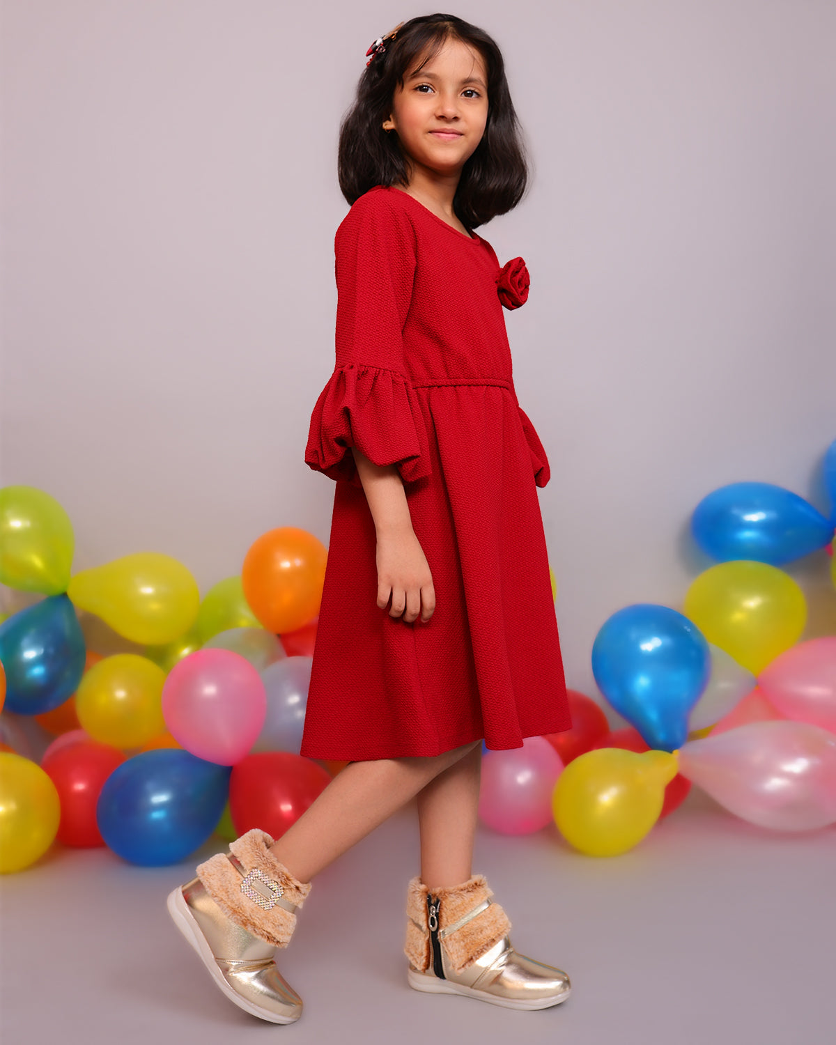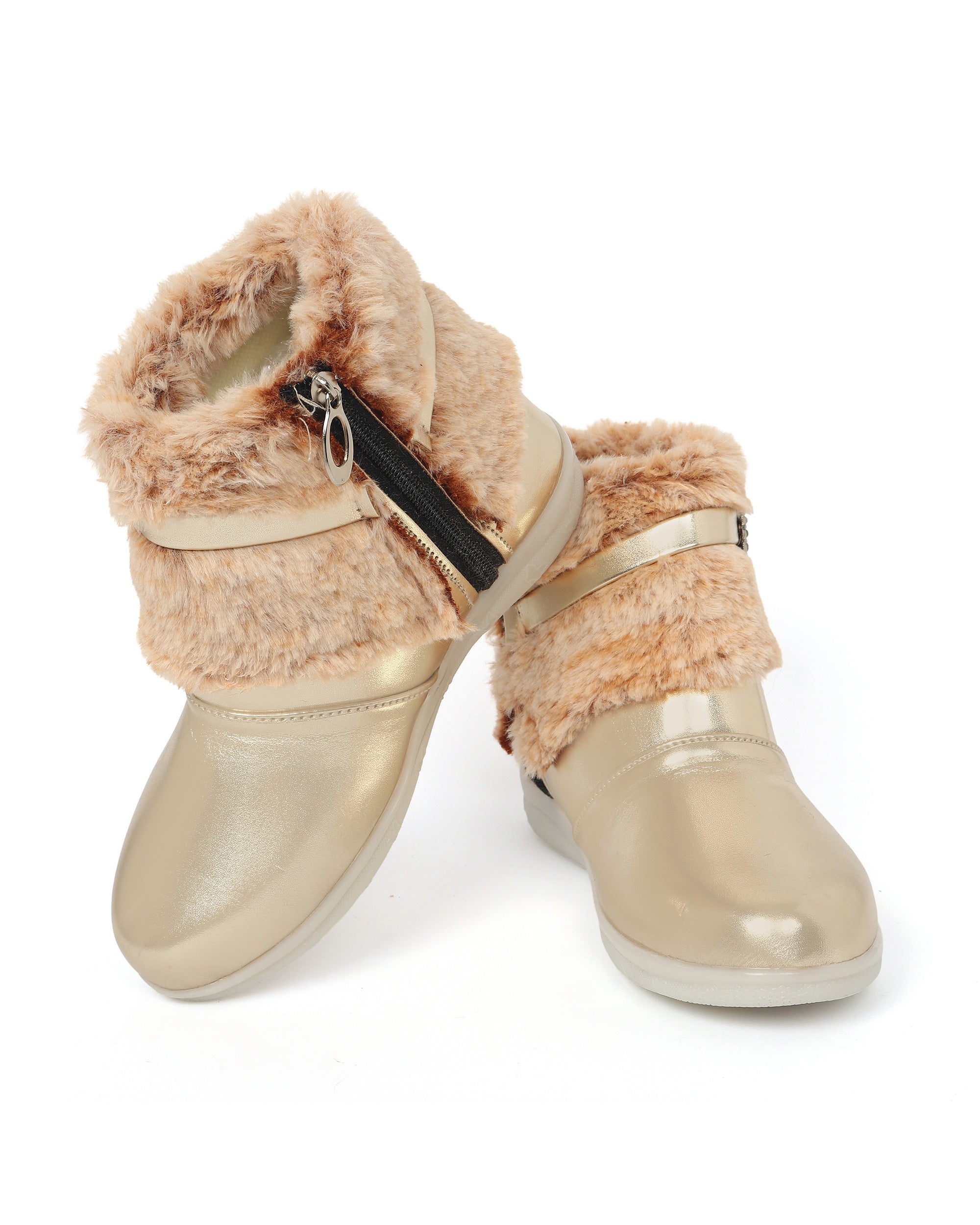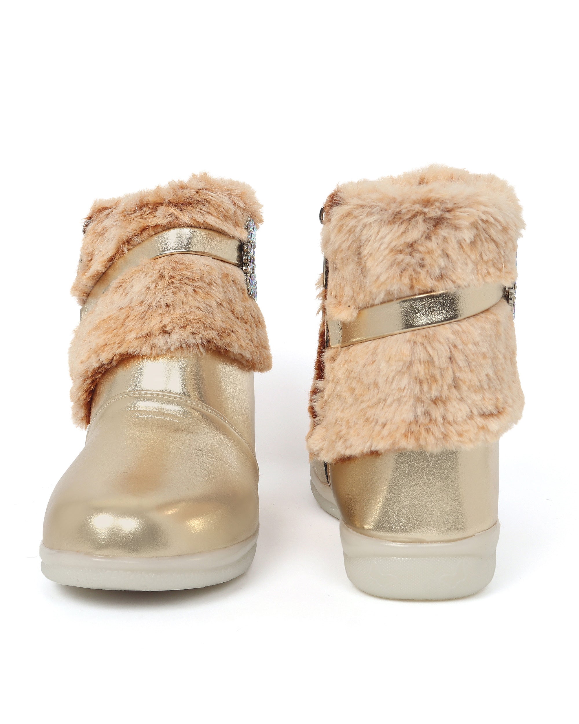 Shiney party boots for girls with faux fur cuff, sparkling crystal buckle, and side zip closure. Comfy and chic—perfect for birthdays, outings, and festive fun. Available in Golden, Silver, Red, White, and Black.