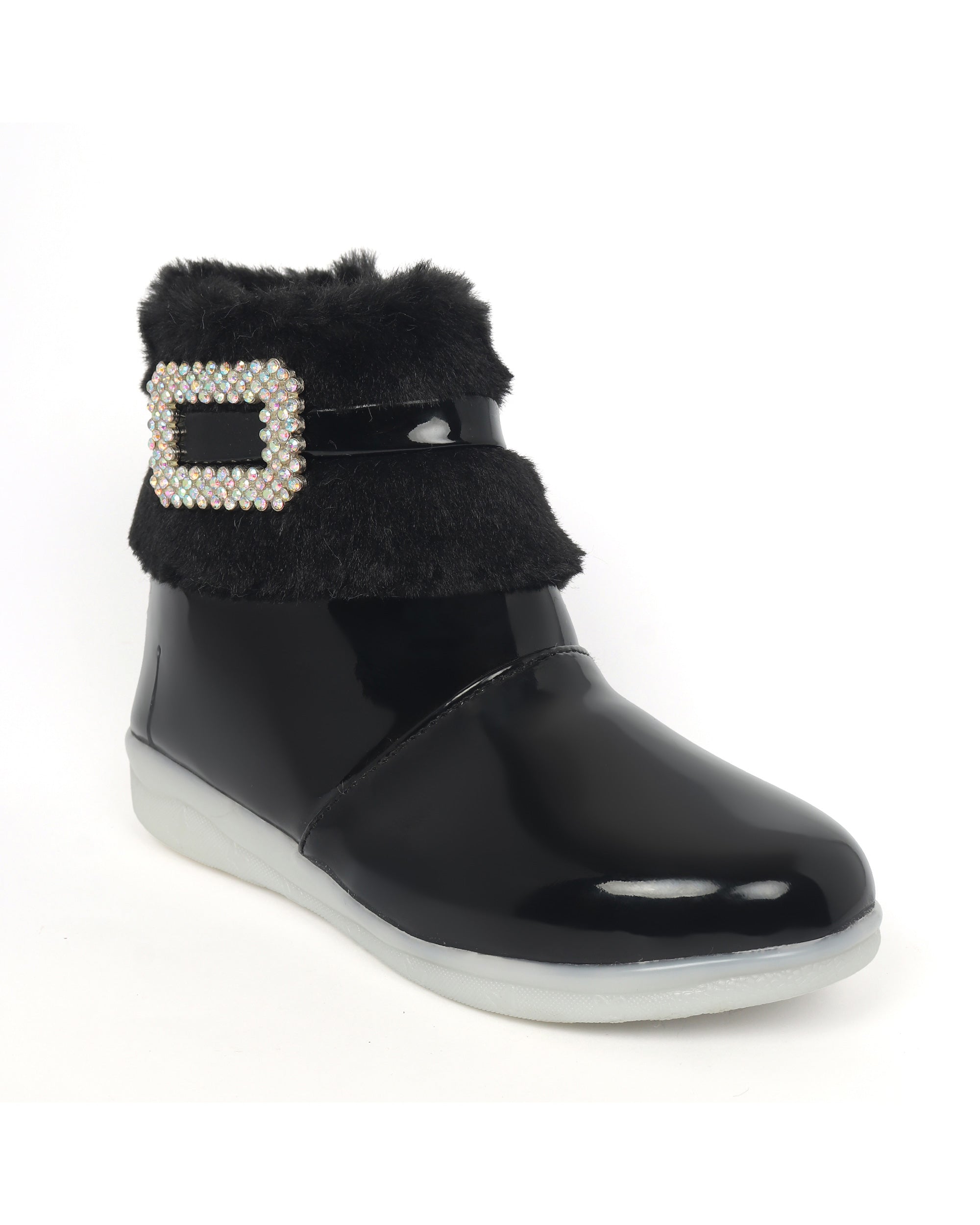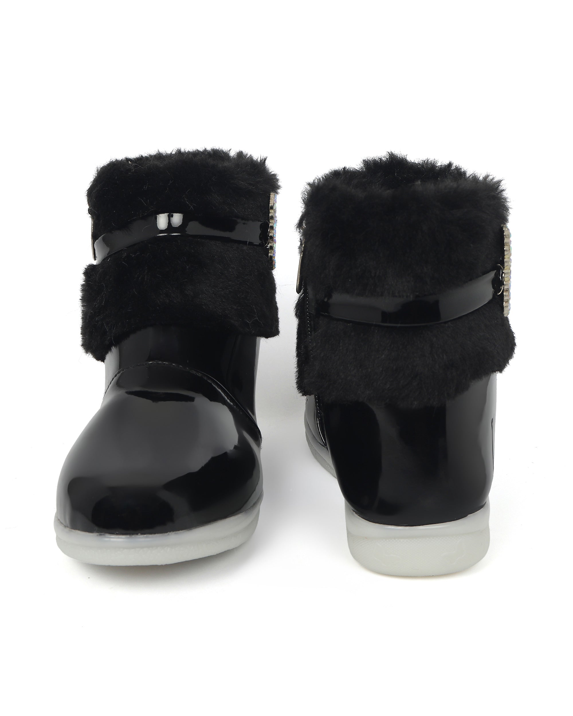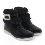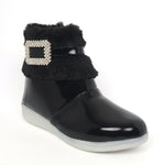 Shiney party boots for girls with faux fur cuff, sparkling crystal buckle, and side zip closure. Comfy and chic—perfect for birthdays, outings, and festive fun. Available in Golden, Silver, Red, White, and Black.