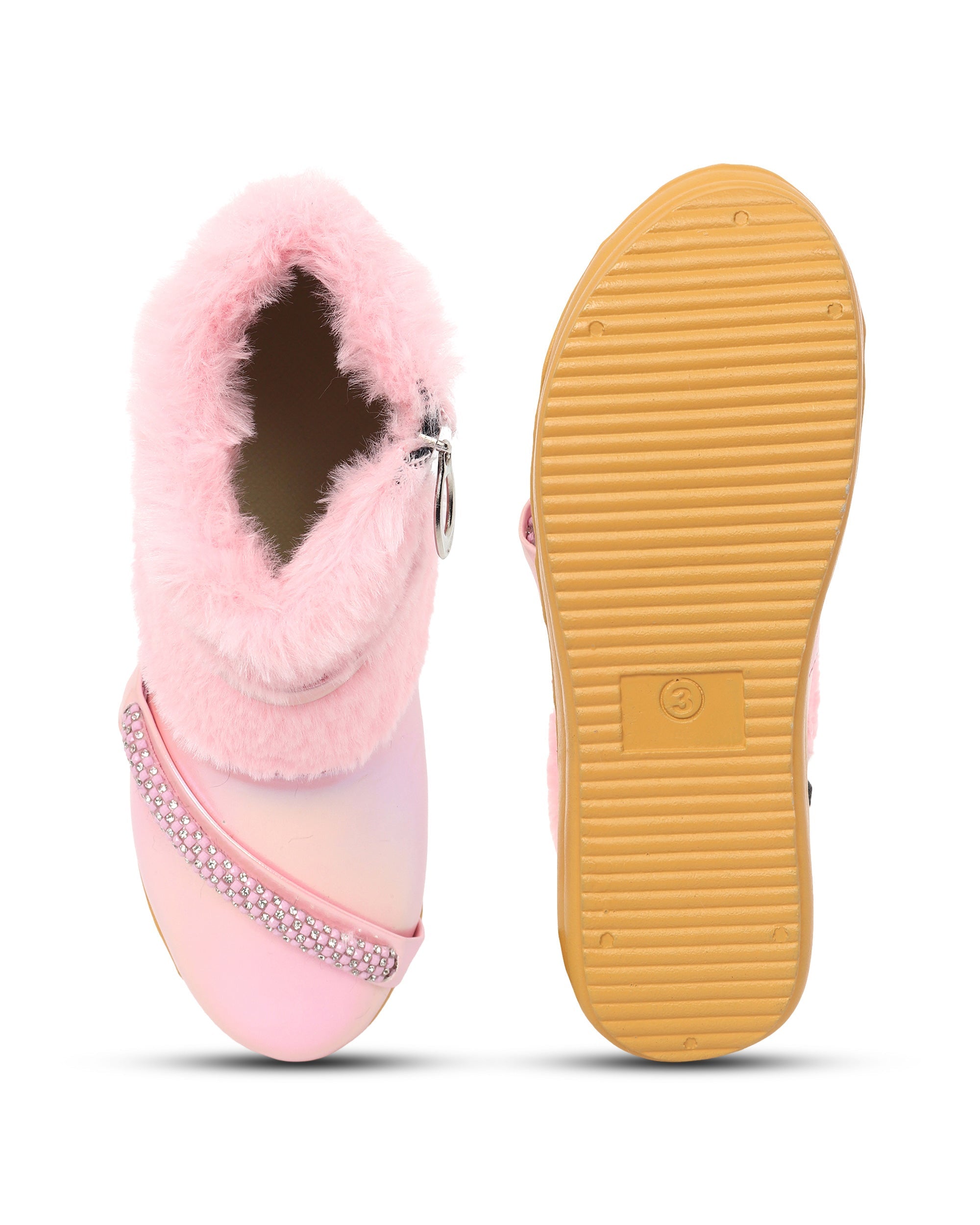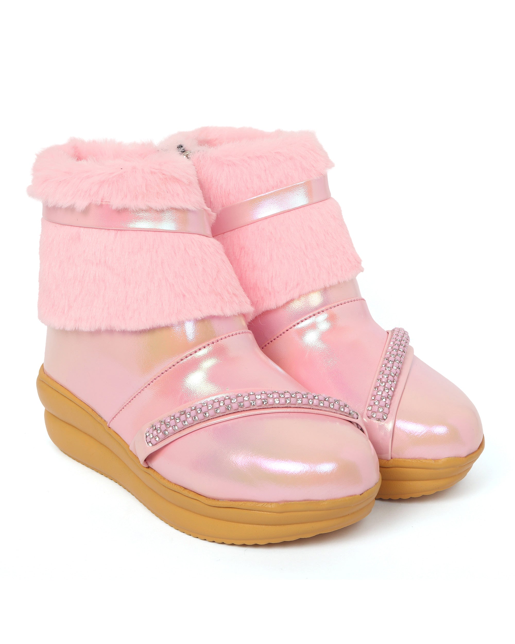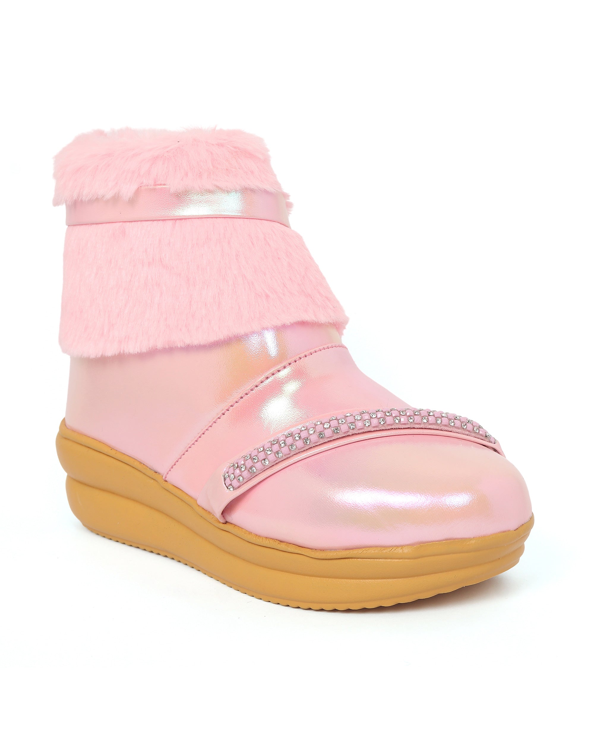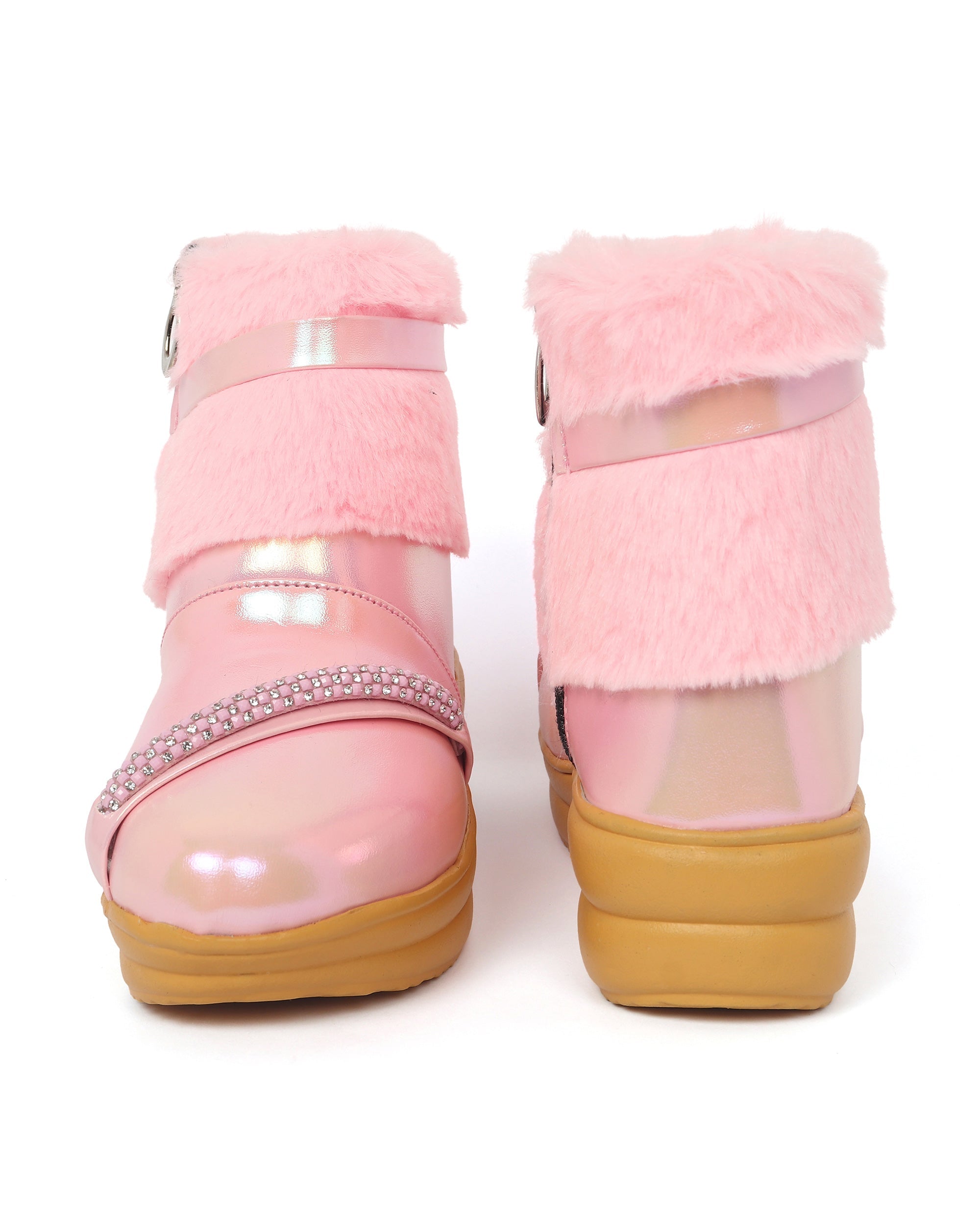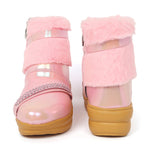 Stylish girls’ boots with glossy PU finish, faux fur trim, and rhinestone strap detail. Easy zip closure for comfort and style. Perfect for parties or casual wear. Available in Pink, White, Brown, Blue, and Beige colors.