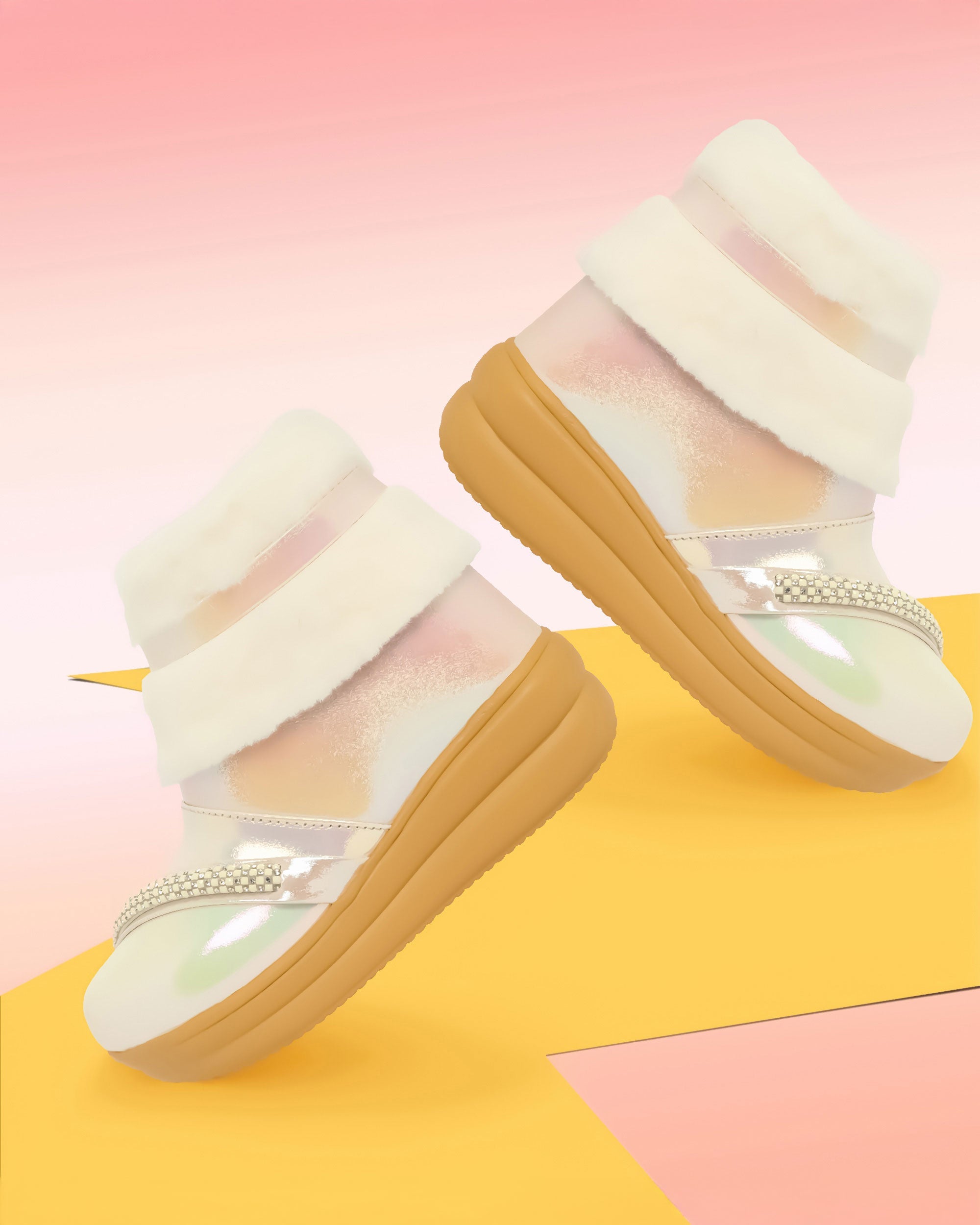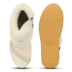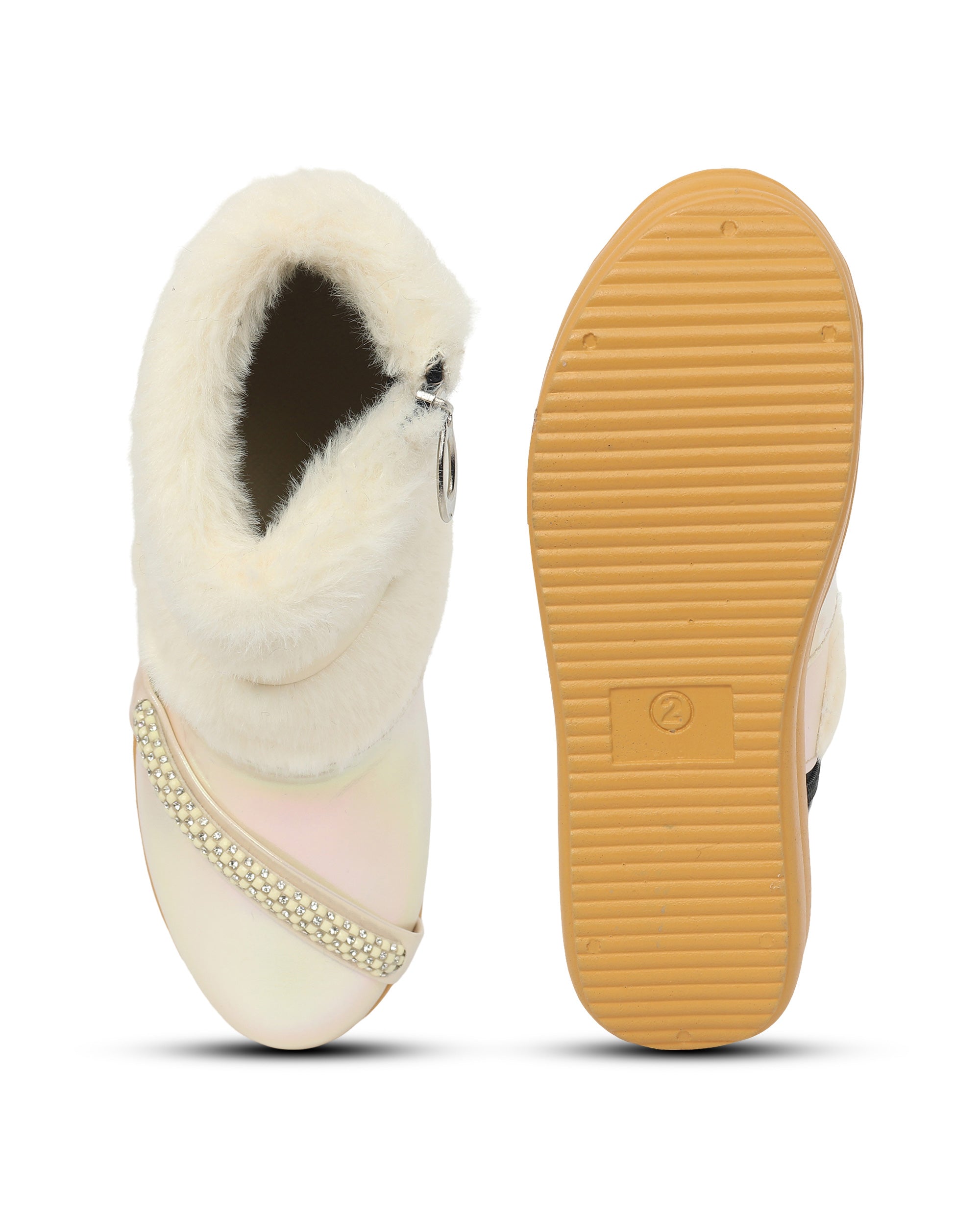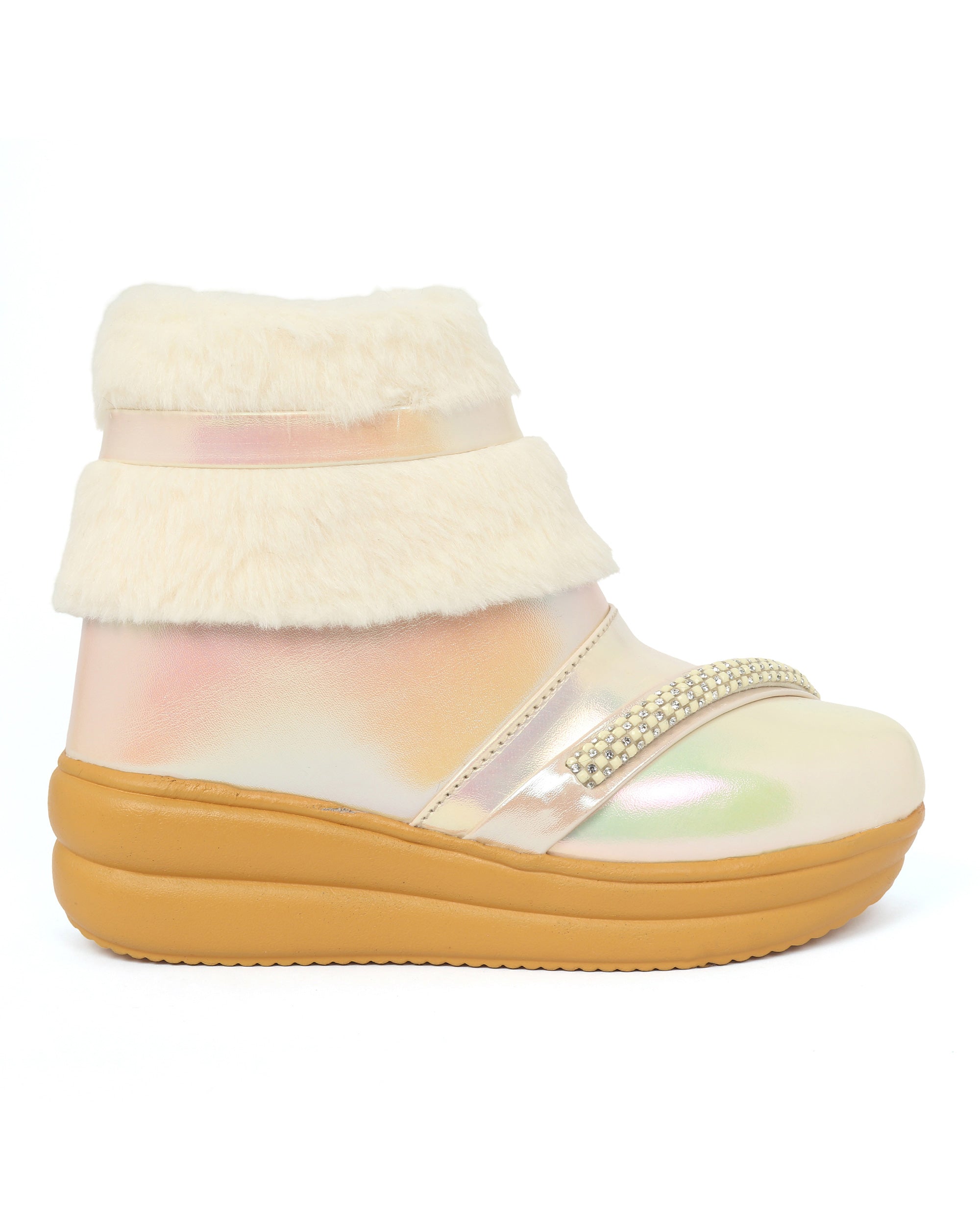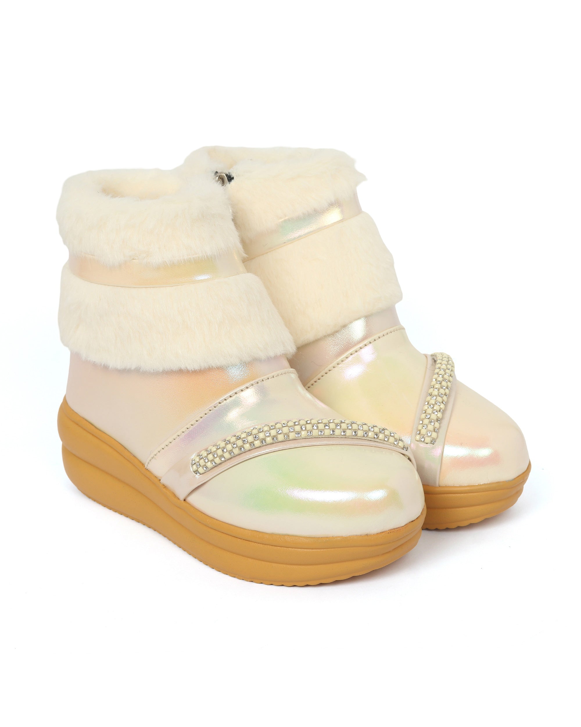 Stylish girls’ boots with glossy PU finish, faux fur trim, and rhinestone strap detail. Easy zip closure for comfort and style. Perfect for parties or casual wear. Available in Pink, White, Brown, Blue, and Beige colors.