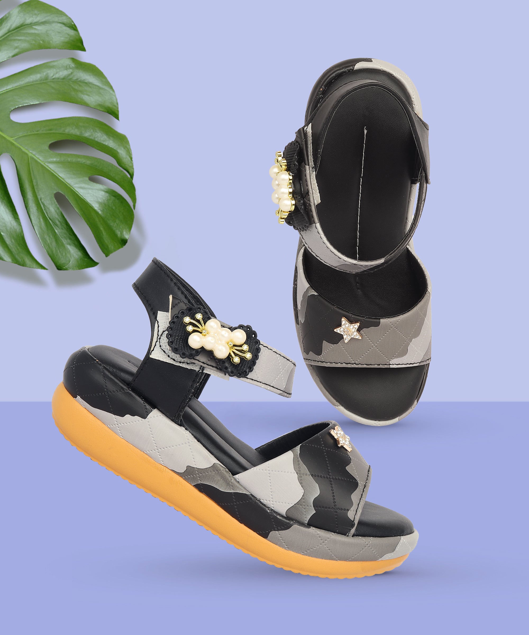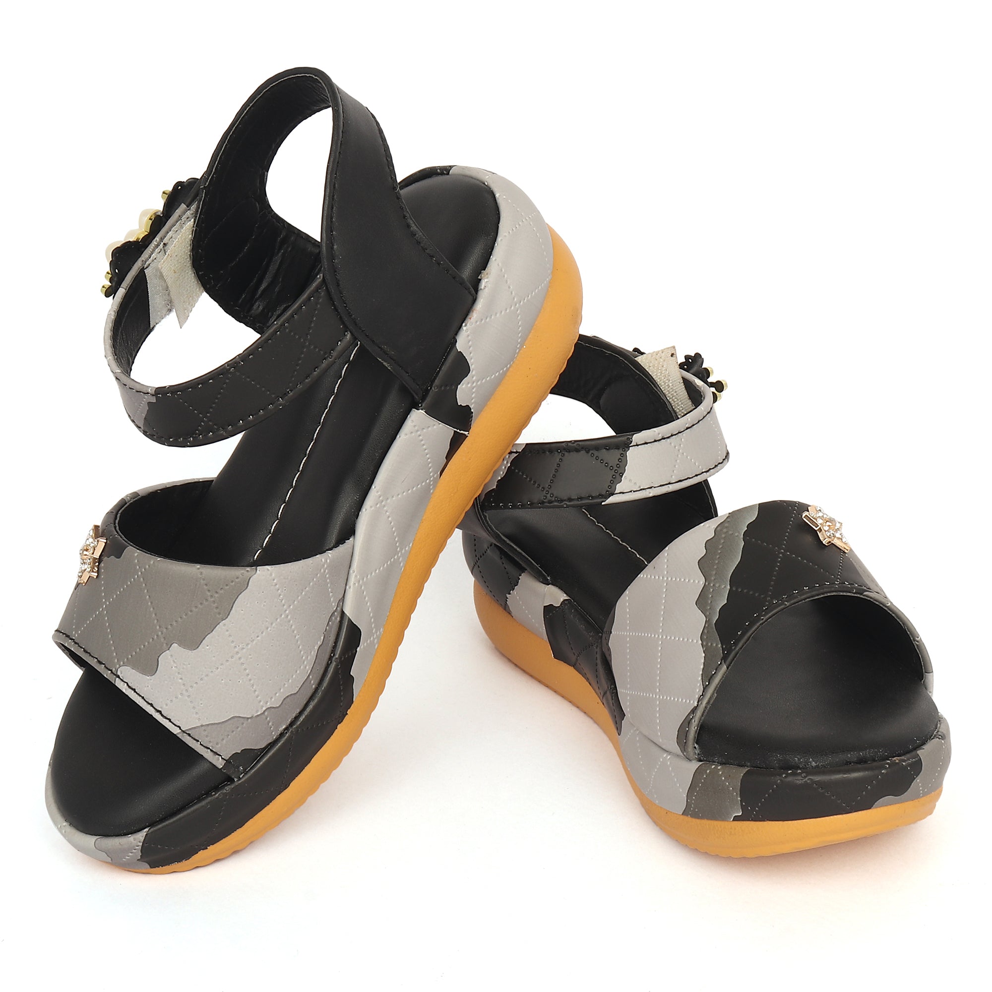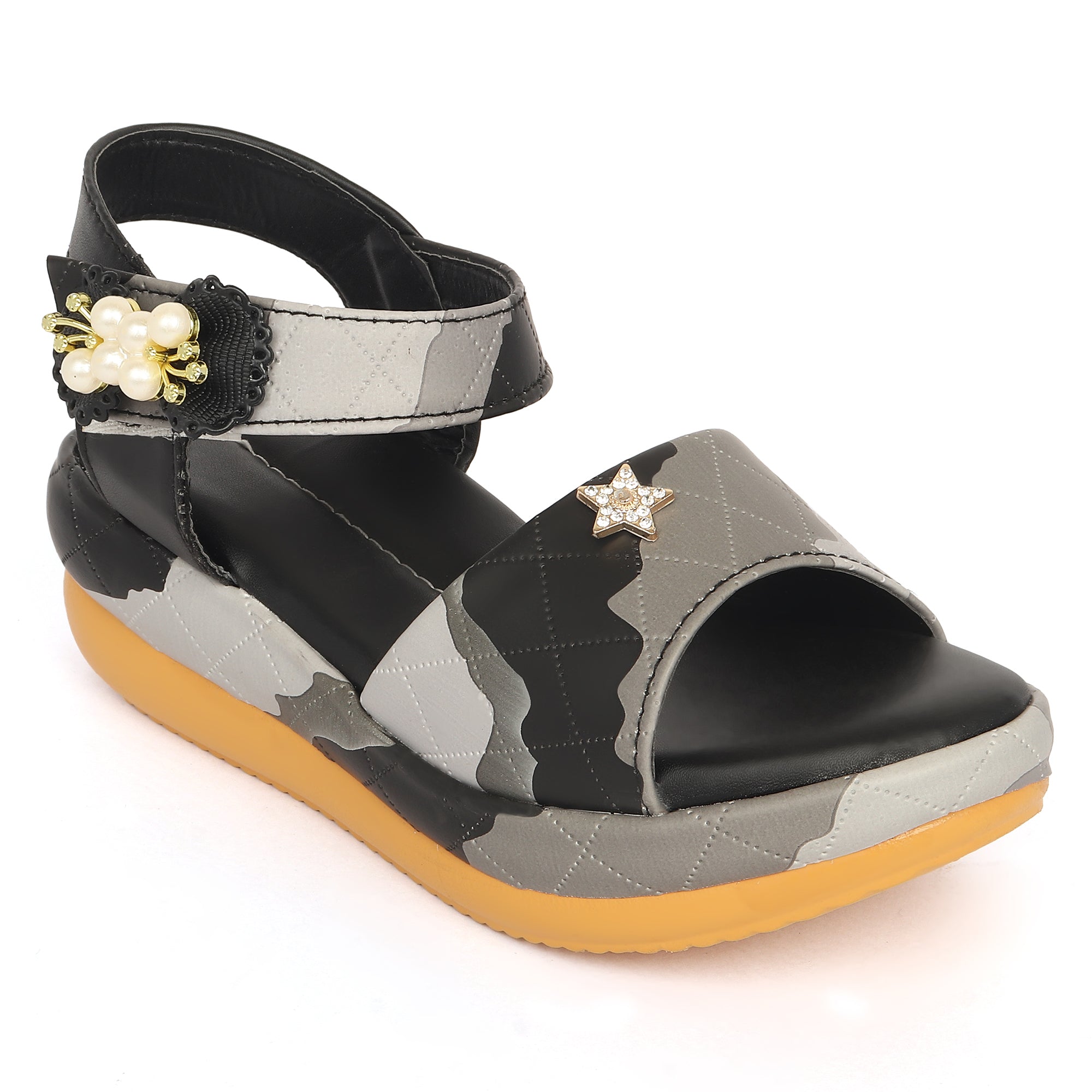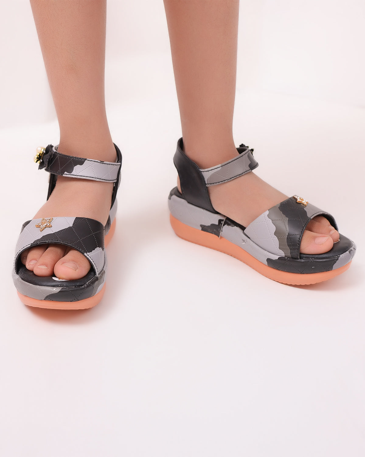 A customer favorite! These Freeplay low wedge sandals are designed in soft faux leather with a playful multicolor quilted finish and sparkly embellishments. The cushioned wedge sole and Velcro strap ensure comfort and support for parties or everyday wear. Available in pink, black, white, and beige. Perfect for girls aged 4–9 years.