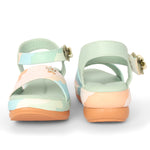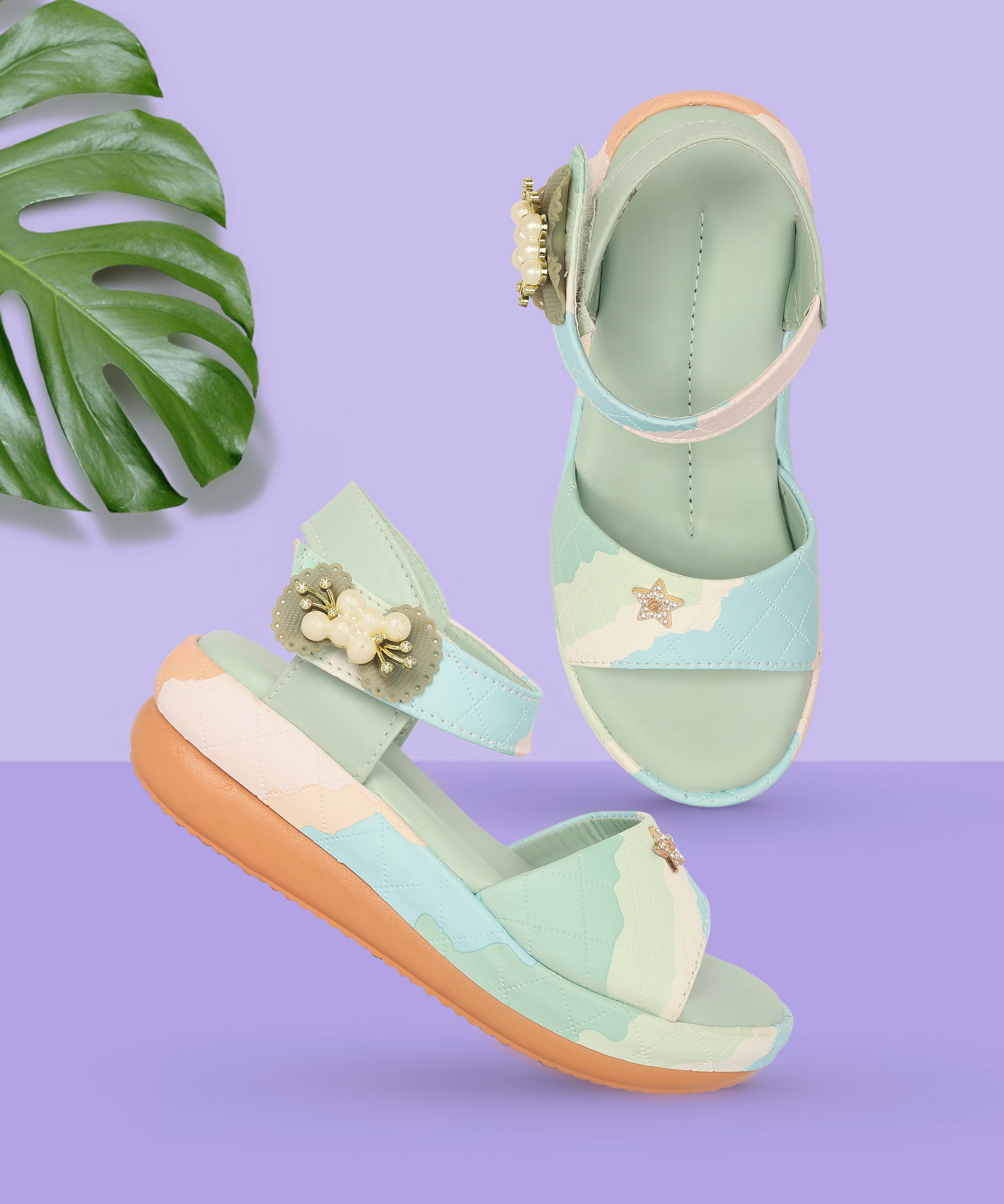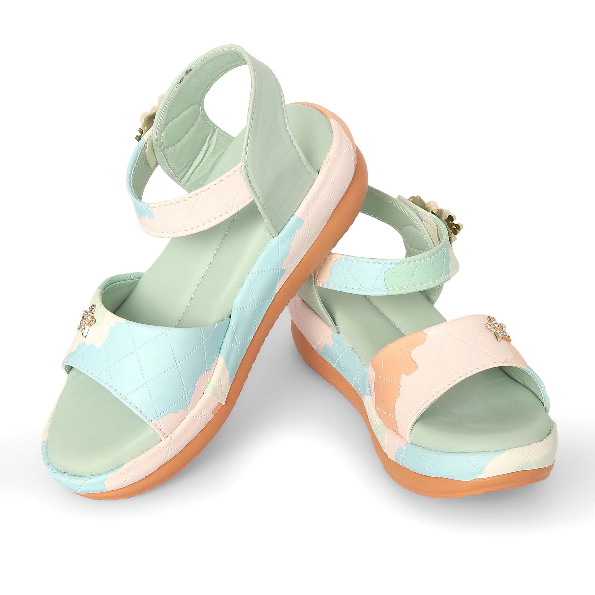 A customer favorite! These Freeplay low wedge sandals are designed in soft faux leather with a playful multicolor quilted finish and sparkly embellishments. The cushioned wedge sole and Velcro strap ensure comfort and support for parties or everyday wear. Available in pink, black, white, and beige. Perfect for girls aged 4–9 years.