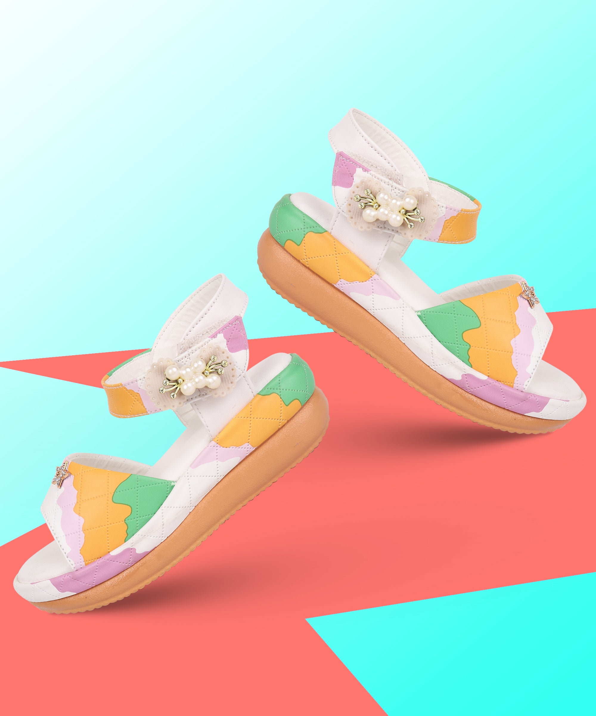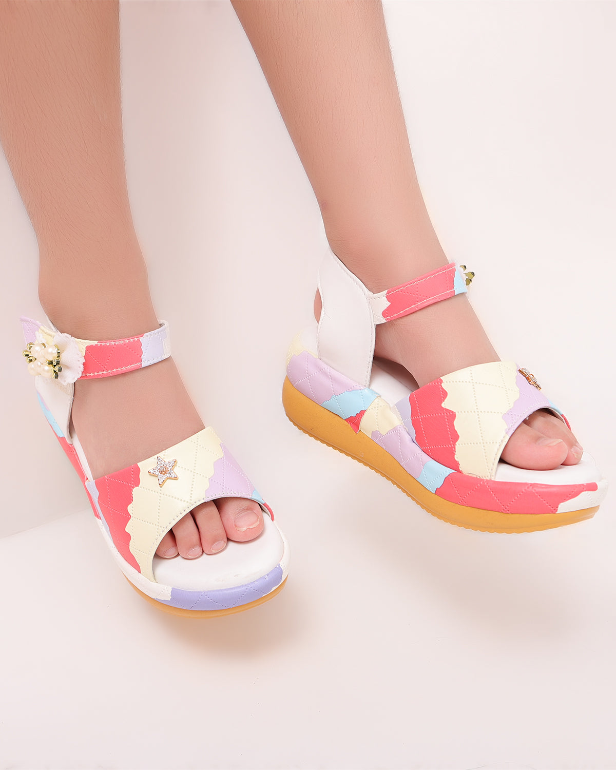 A customer favorite! These Freeplay low wedge sandals are designed in soft faux leather with a playful multicolor quilted finish and sparkly embellishments. The cushioned wedge sole and Velcro strap ensure comfort and support for parties or everyday wear. Available in pink, black, white, and beige. Perfect for girls aged 4–9 years.